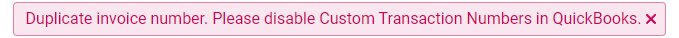 If custom transaction numbers are on, QuickBooks Online will use whatever invoice number Ruddr provides. But, that invoice number must not already exist in QuickBooks Online. If that invoice number already exists, Ruddr will show a "Duplicate invoice number" error message, as shown below.