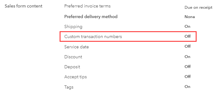 Figure 1 - Custom Transaction Numbers Setting in QuickBooks Online