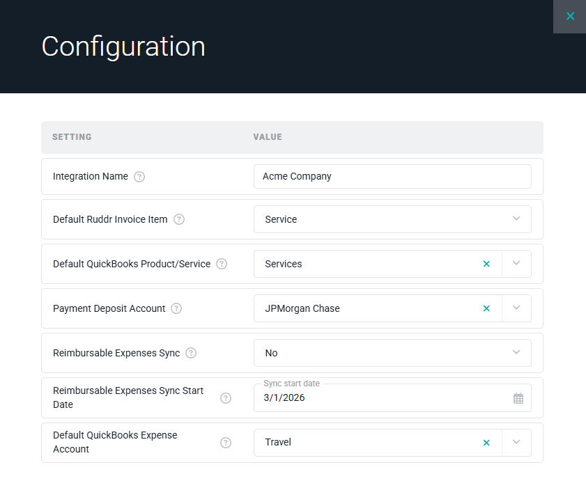 Payment Deposit Account - When a payment is applied to an invoice within Ruddr, that payment will be synchronized to QuickBooks. When Ruddr creates the payment in QuickBooks, it will use the specified deposit account when saving the payment.