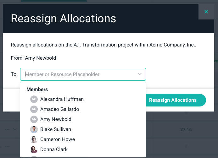 A screen will appear (Figure 13) for you to either reassign to another member or you can move this allocation to a placeholder spot. Once complete, you will be able to submit and the allocation and all the details will move.