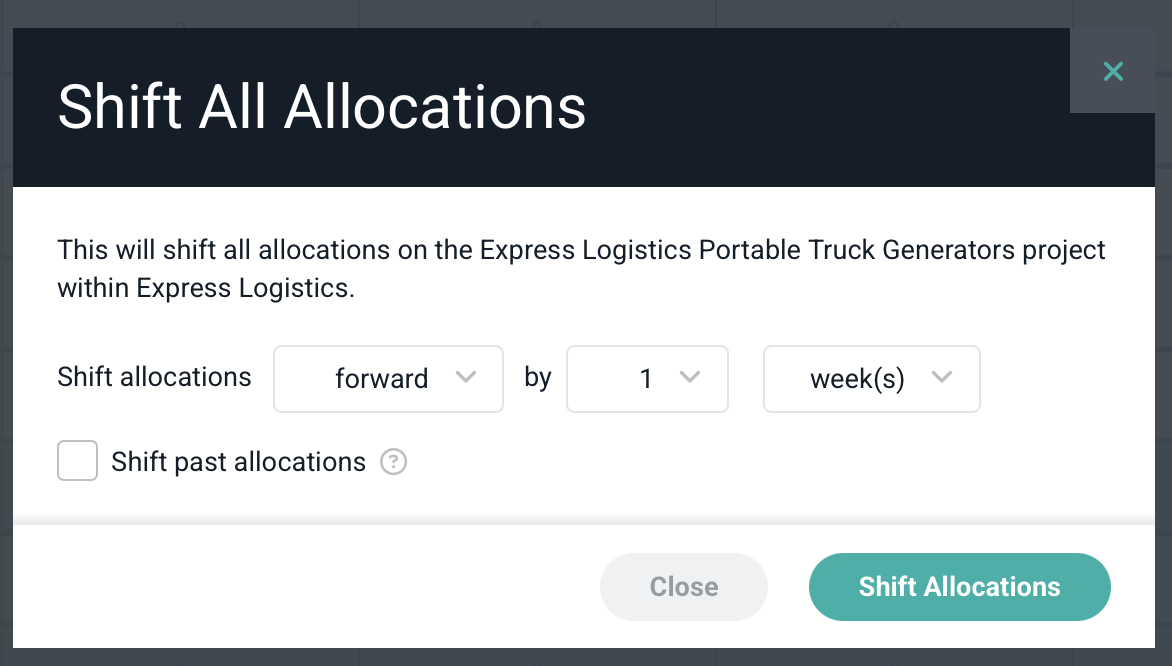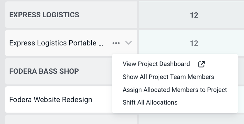 To shift an allocation, you will need to be in the Project view. Once you expand a project, you will select the 3 dotted lines. A pop up will appear to Shift All Allocations. (Figure 14)