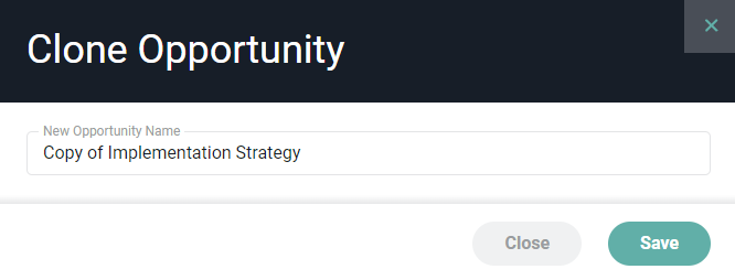 To clone an opportunity, you must have the Administer all companies and opportunities permission. Simply click on the Clone menu option (Figure 4) on the row that you want to clone. You will then be prompted (Figure 8) to provide a name for the new opportunity. Clicking the Save button will create the opportunity and take you to the new opportunity's dashboard, where you can edit the new opportunity.