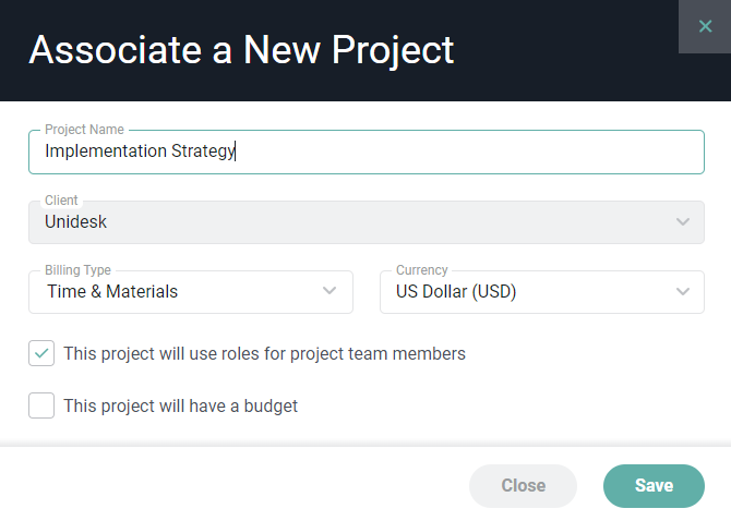 To create a project, click on the Create a Project menu option (Figure 4) on the row for which you want to create a project. You will then be prompted by the Associate a New Project modal (Figure 8) to specify details for the new project. Clicking the Save button will create the project and take you to the project dashboard, where you can continue setting up the project.