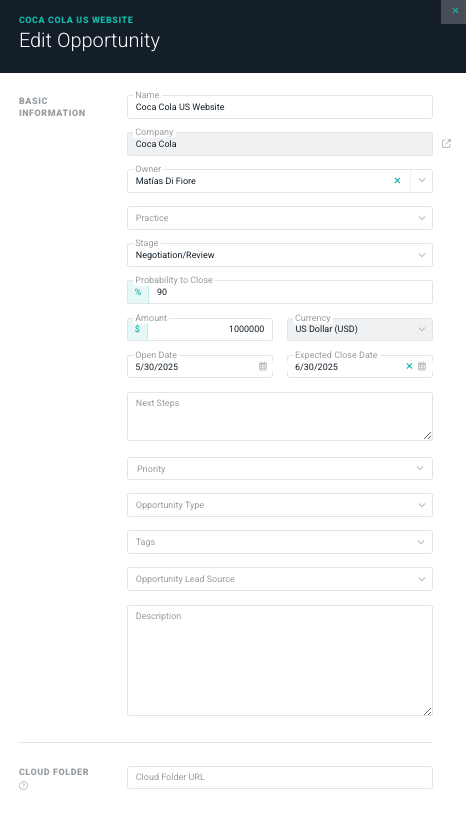 - Opportunity Type - Select from a list of opportunity types that are managed in Custom Data.