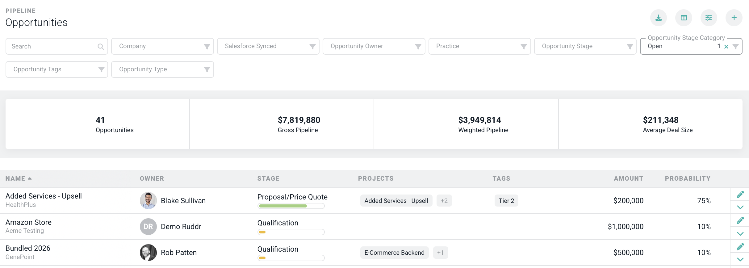 - Weighted Pipeline - the total sum of the weighted amounts of the opportunities listed. The weighted amount of an opportunity is the total amount multiplied by the Probability to Close percentage.