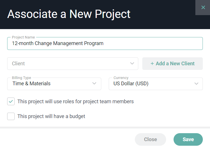 Upon clicking the New Project button, you will be prompted (Figure 9) to provide some details regarding the new project. Note that the Project Name will default to the name of the opportunity. If a Ruddr client is associated with the opportunity's company, then the Client name will be defaulted to that client and disabled. If a client is not associated with the company, you will be prompted to either select a client or to create a new client to associate with the project.