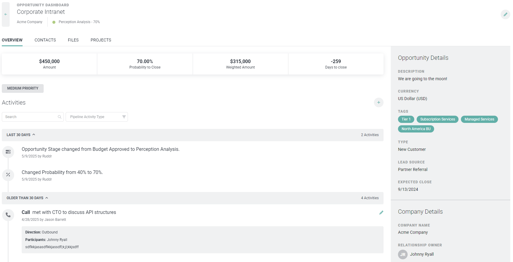 The opportunity dashboard (Figure 4) presents information about the opportunity as well as any related pipeline activity. The opportunity dashboard also includes an opportunity's contacts and any files that you wish to associate with the opportunity.