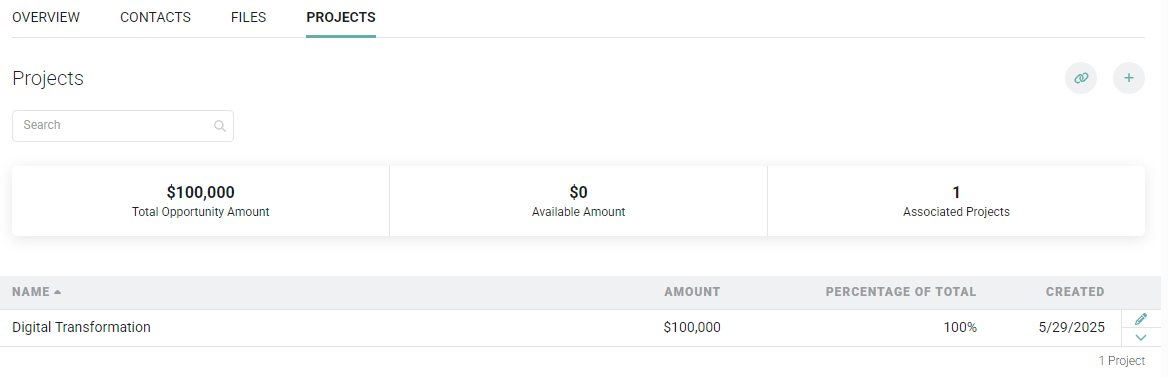 Figure 6 - The Projects Tab on the Opportunity Dashboard Allows you to Associate New or Existing Projects