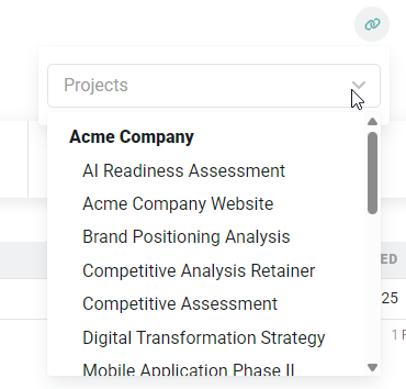 When you click on the Associate Existing Project button (Figure 8), a dropdown (Figure 10) will be presented with a list of projects for the client that is associated with the opportunity's company. Select the project that you wish to associate with the opportunity.