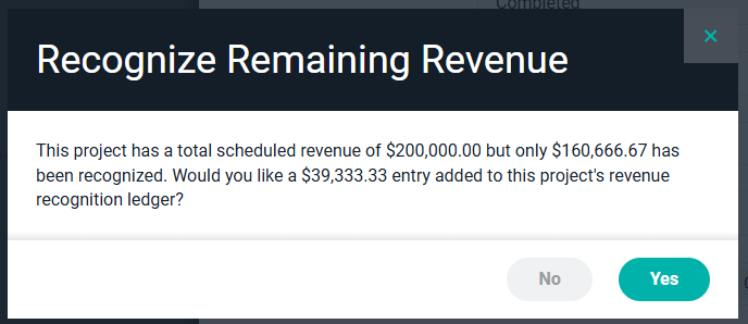When a fixed fee project that uses the revenue recognition ledger is set to Completed, Ruddr will check to see if there is any remaining services revenue budget to be recognized. If there is, Ruddr will ask the user if it should recognize that remaining revenue (Figure 5). If the user confirms, a final revenue recognition row will be added to the revenue recognition ledger.
