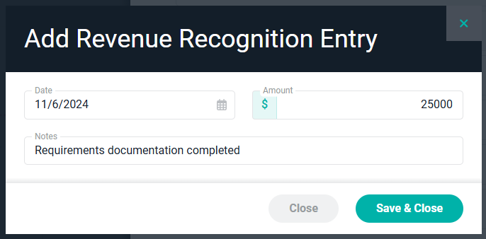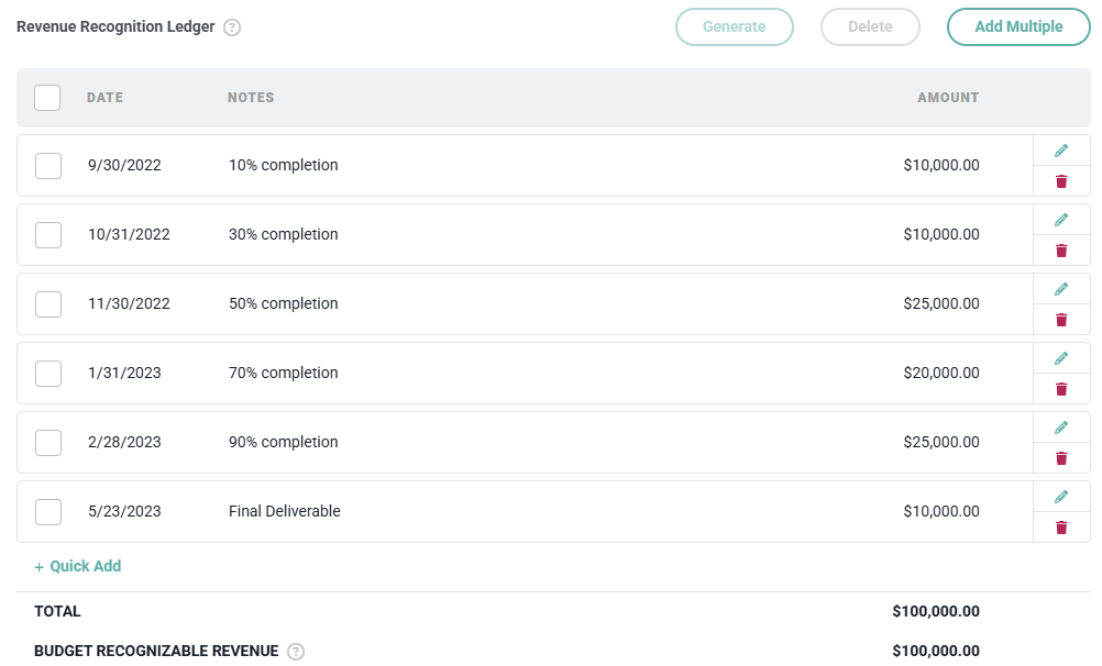 In cases where the project will recognize the same amount of revenue over a number of months, the Add Multiple button will allow you to easily create many monthly revenue recognition entries with a single action. For projects that span several years, this bulk action can save a tremendous amount of time.