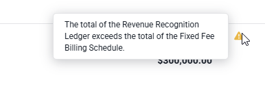 When the total of the revenue recognition ledger exceeds either the total of the fixed fee billing schedule or the budget recognizable revenue, Ruddr will display a notification warning (Figure 2) of such.