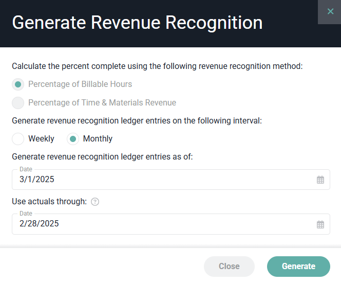 Ruddr can automatically generate past and future revenue recognition ledger entries via the Generate button at the top of the ledger. The Generate button evaluates project actuals through the previous day and forecasted values from today forward to create revenue recognition entries. The button brings up the Generate Revenue Recognition window which captures four important pieces of information: