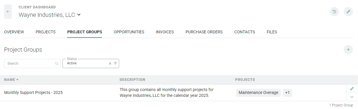 When the Project Groups feature is enabled in the workspace, a Project Groups tab (Figure 1) will be added to the Client Dashboard for each client in the workspace.