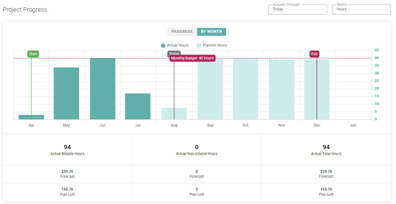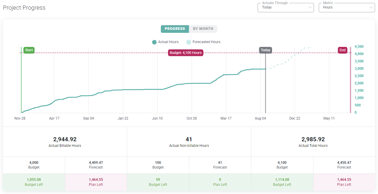 Below the Project Progress graph are the hours for the project broken down by total hours, billable hours, and non-billable hours. Non-billable projects will not show a billable hours total. If the project has budget hours defined, those will be shown for each category of hours, along with the number of total of forecasted hours (actuals + plan left) and plan left (allocated).