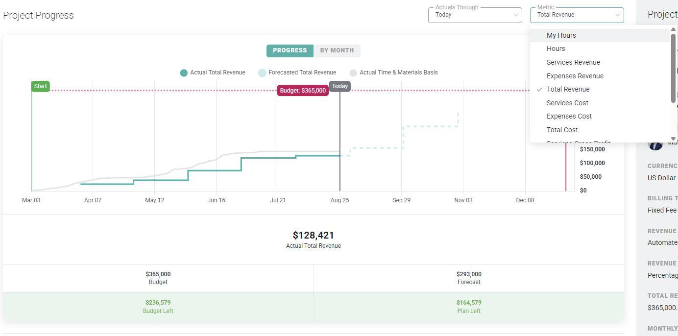 Additionally, the graph can be switched to show additional metrics when the project is billable and if the member's security role has specific project-level permissions for the project. By selecting the metric from the Metric dropdown (Figure 5) above the graph, the member can see actuals-to-date and projections, based on future resource allocations, for Labor Cost, Total Cost, Services Gross Profit, Total Gross Profit, Services Gross Margin, and Total Gross Margin.