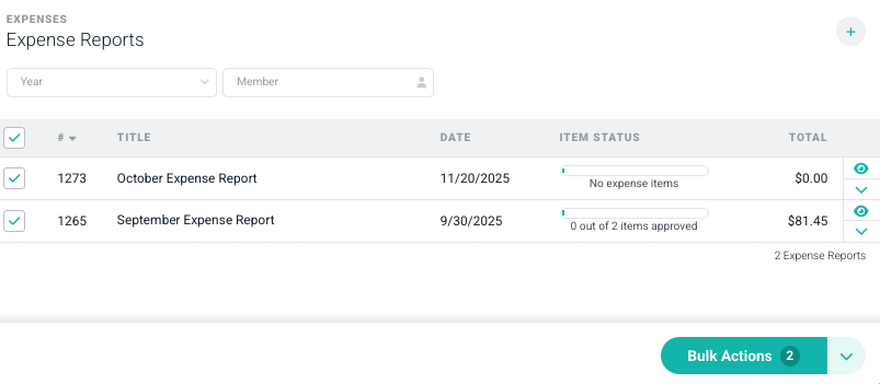 Multiple expense reports can be deleted utilizing the bulk update feature. In the Expense Report section, you can select the expense reports you want to delete. (Figure 3) Once selected, you can select the Bulk Actions option in the bottom right to delete.