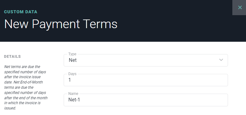 Figure 17 - Create a New Payment Term in Custom Data