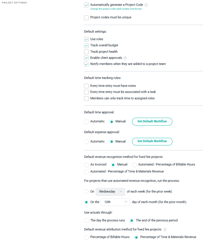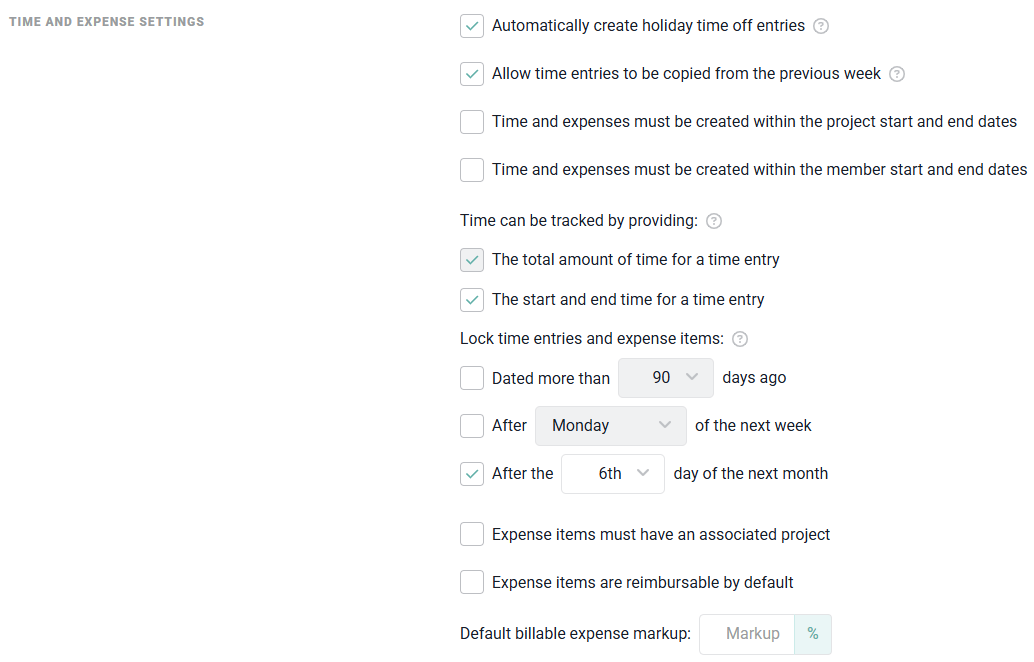 The Time and Expenses Settings section (Figure 7) allows you to adjust settings related to: