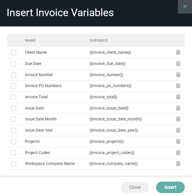 In this section, you can include invoice variables in the Invoice Subject field as well as the Invoice Note field. By clicking the Invoice Variables link above the setting text box, you can insert an invoice variable (Figure 4) at any point within the text of the field. You can either check the box next to any variable(s) you wish to include at the point where your cursor currently is in the field, or you can click the clipboard icon next to any variable to copy the variable name for inserting at any point in the text.
