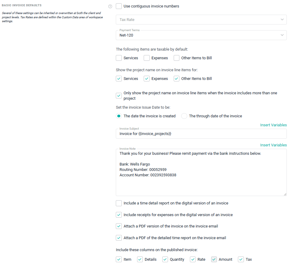 Lastly, you can set the default list of invoice columns to include on the published invoice.