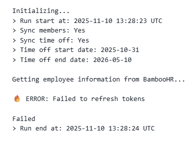 If you receive an error log from Ruddr, indicating that the BambooHR sync failed, you may find that BambooHR produced a "Failed to refresh tokens" error (Figure 1).