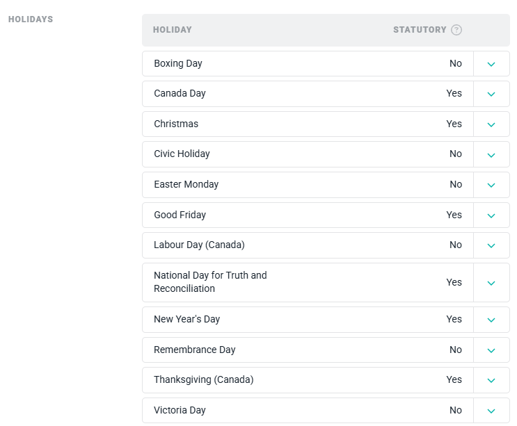 When a Holiday Schedule is created in Ruddr, any holiday can be set as statutory. Below is an example of a Canadian holiday schedule that includes both statutory and standard company holidays.