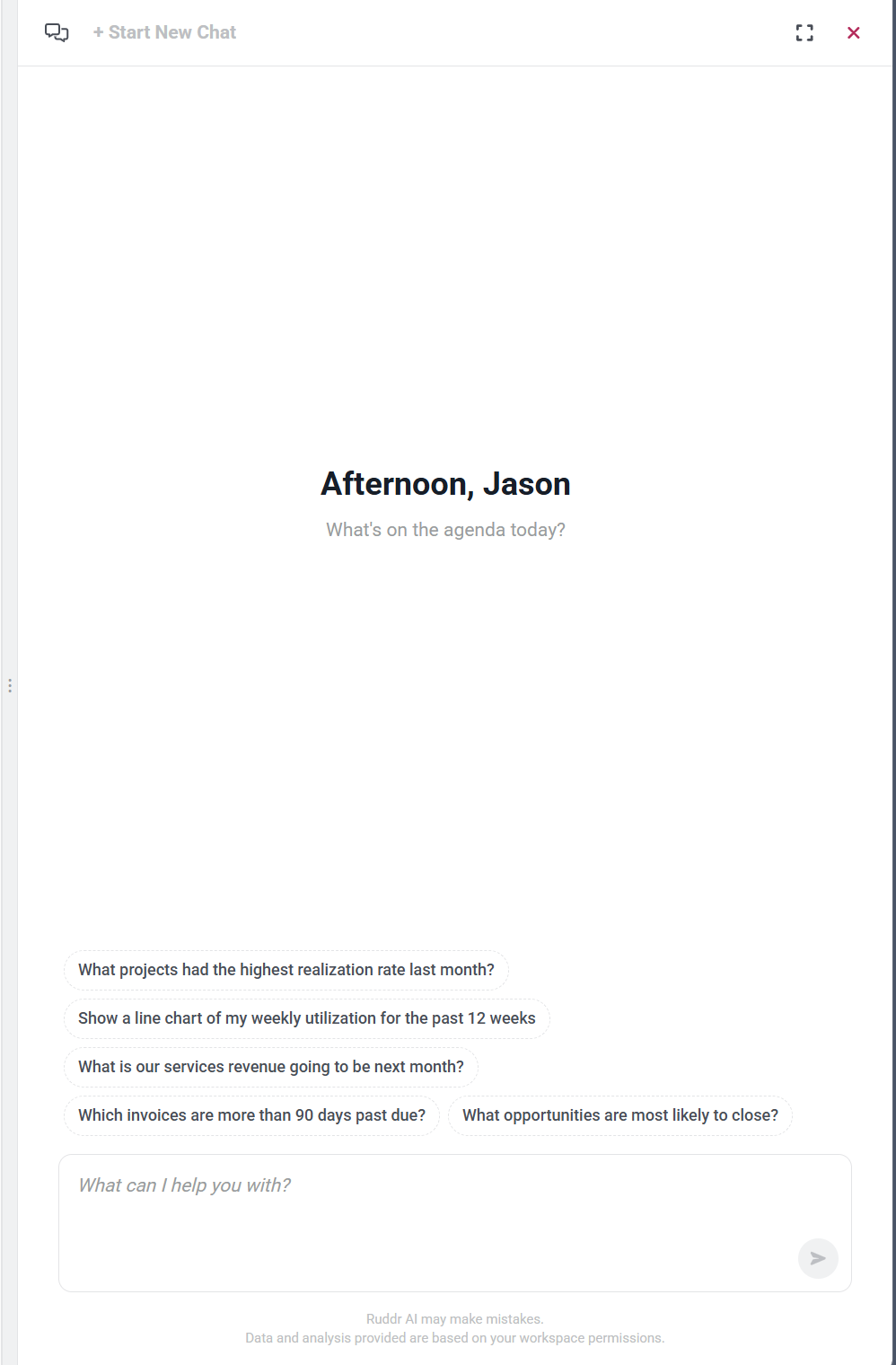 The + Start New Chat button (Figure 5) begins a fresh conversation. Use it when you want to ask a new question, switch topics, or clear out the context from a previous conversation. Starting a new chat is helpful when you want a clean slate for a different task, such as looking up a report, exploring a new dataset, or asking about a separate Ruddr feature.