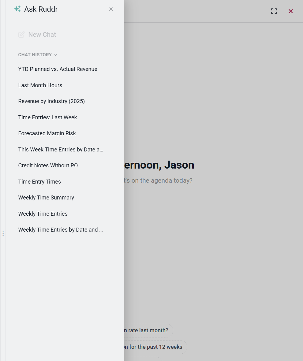 Just click the Ask Ruddr button to begin a conversation with the Ruddr Assistant. The assistant can: