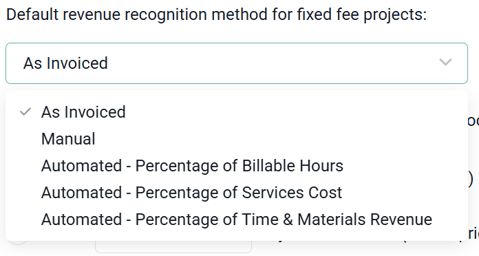 Ruddr performs automated revenue recognition either once per week or once per month, for all fixed fee projects in the workspace that use an automated method. The timing of the automated revenue recognition process can be set within the Project Settings of Workspace Settings, as shown below.
